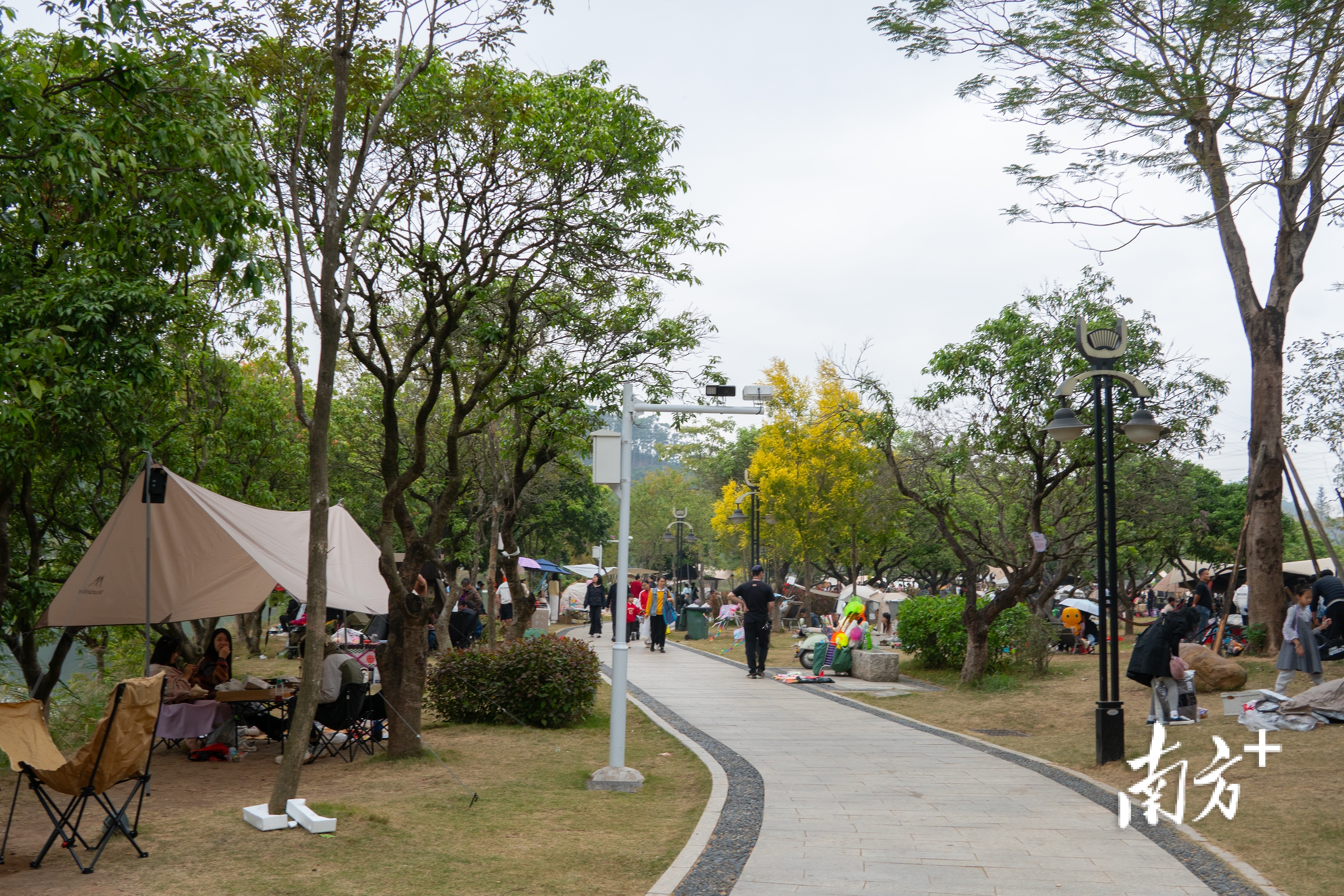 尽管天公不作美,细雨绵绵,却依然挡不住市民奔赴自然的脚步。走进公园,金色稻田随风轻摆,不少游客举着手机在田埂间定格美景;蜿蜒的绿道上,骑行爱好者穿梭其间,笑声与车轮滚动声交织;湖边草坪上,一顶顶天幕、帐篷错落有致,市民们围坐闲谈,面朝湖水呼吸着湿润清新的空气,尽享周末惬意时光。动静相宜的画面,构成了一幅生动的初冬游园图。