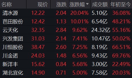 早盘,磷化工板块表现活跃,成为市场关注焦点。清水源20CM涨停领涨,澄星股份、芭田股份涨停,云天化涨超9%,兴发集团、川恒股份涨超7%掌柜配资,川金诺、新洋丰、湖北宜化涨超5%。